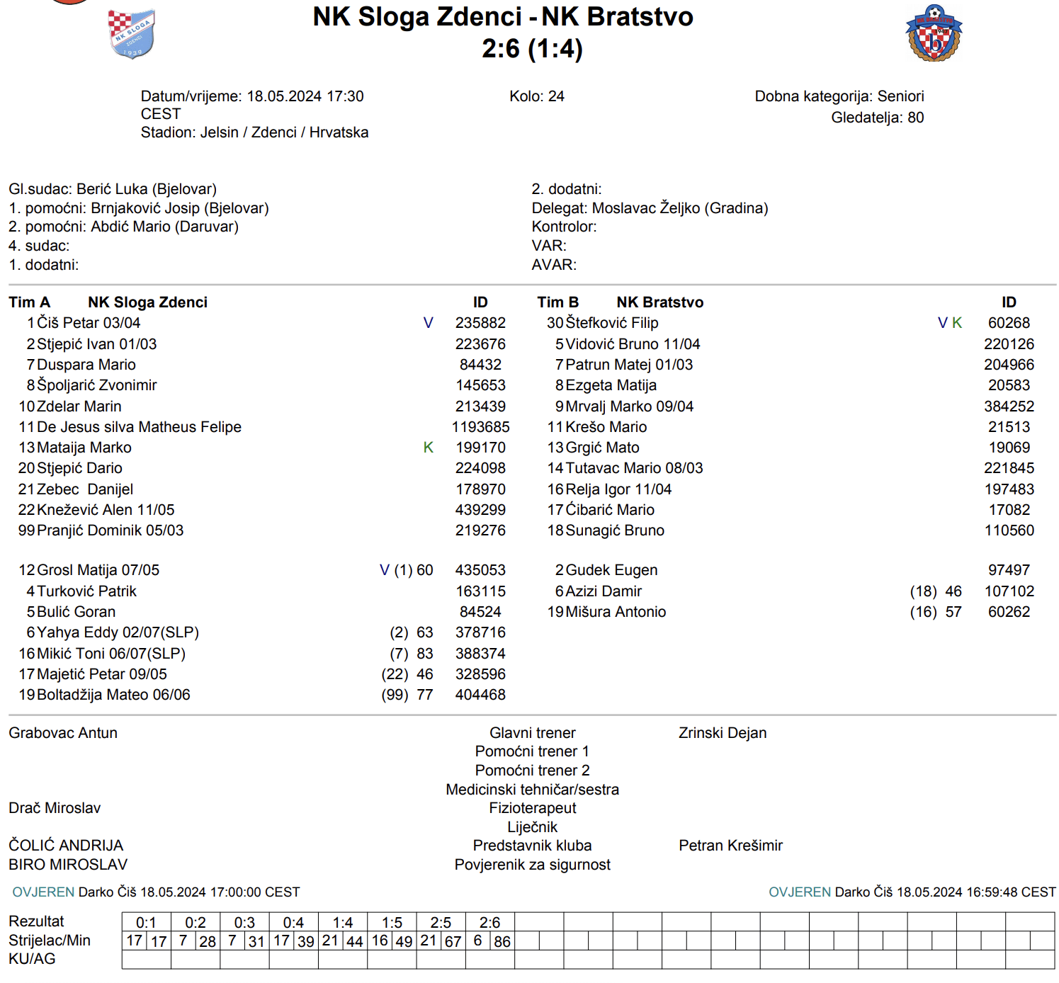 Bratstvo je u Zdencima uzelo 3 boda. Već u prvom poluvremenu Bratstvo je zaključilo utakmicu. Mario Ćibarić i Matej Patrun postigli su po 2 pogotka za Bratstvo, dok je za Slogu pogodio Danijel Zebec, i s rezultatom 1:4 se odlazi na odmor. U drugom poluvremenu golove za Bratstvo su postigli Igor Relja i Damir Azizi, dok je za Slogu opet pogodio Zebec.