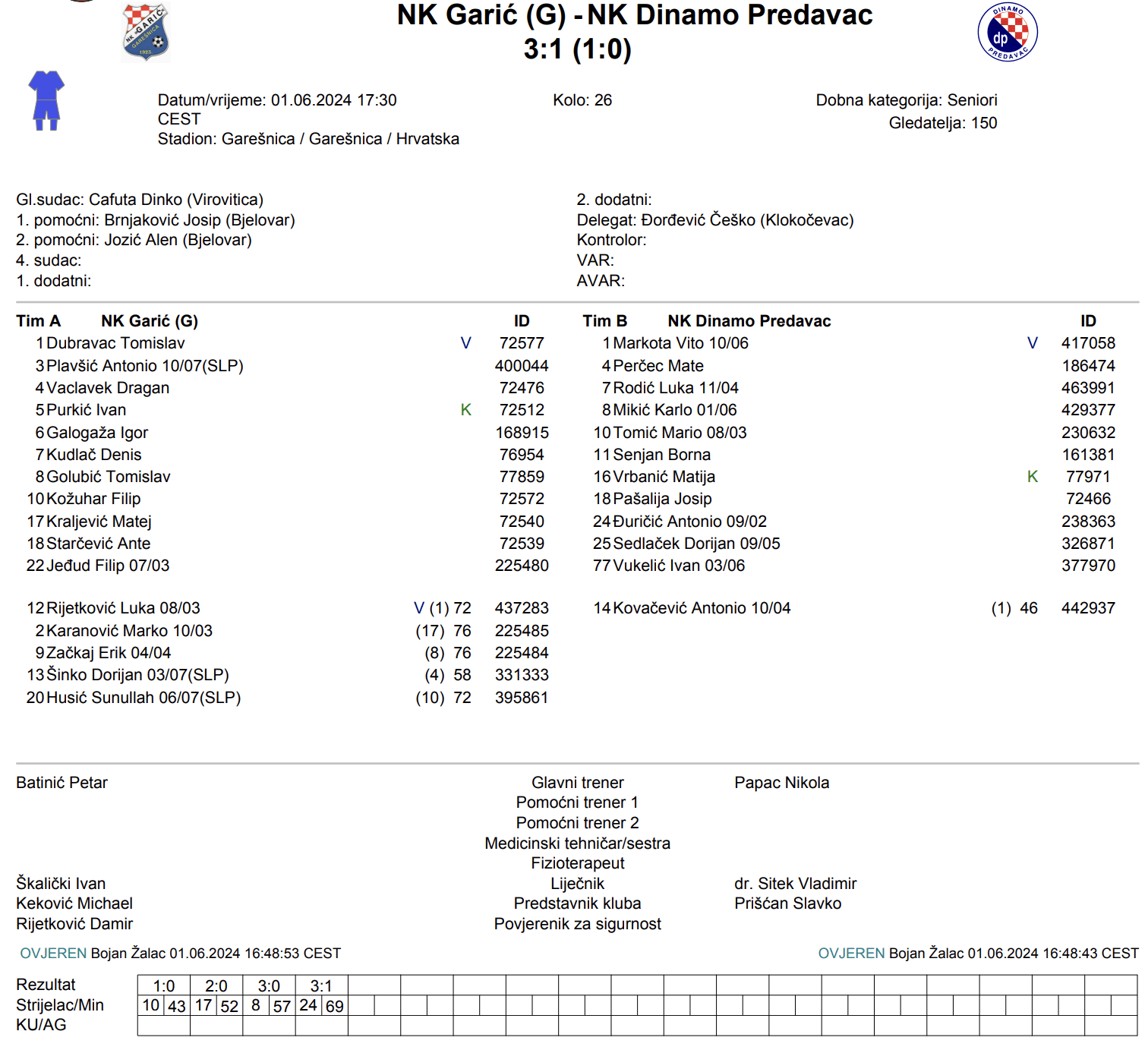 Danas smo protiv kvalitetne momčadi Garića igrali čak bez dvanaestorice igrača koji su izostali zbog povreda ili radnih obaveza. Tako su u prvih jedanaest uskočila čak četiri juniora. Odoljevali smo sve do 43. minute kada je domaćin zasluženo poveo 1-0. Već u 53. i 57. minuti domaćin postiže dva gola. Ipak, mi golom Đuričića u 69. minuti smanjujemo na 3-1. Isti igrač minutu kasnije propušta postići još jedan gol. Do kraja susreta bili smo još nekoliko puta opasni iz kontri, ali na kraju je rezultat ove utakmice realan. Iako smo uspjeli plasirati se u 3. HNL Sjever, što nam je bio cilj, moramo reći da smo “proljeće” završili sa šest bodova manje od plana. Razlog su svakako povrede i neigranje, prije svega našeg prvog strijelca iz jeseni Stanesa Djefa Monkapa, kao i drugog napadača Josipa Gegića. Gotovo cijelo prvenstvo zbog povrede nije igrao Dominik Bošnjak, dosta je izostao zbog povrede Jozo Filjić i Franjo Jaković, te zbog radnih obaveza dosta su izostali iskusni Matej Bošnjak i Albert Nreca. Da smo bili kompletni, plan bi sigurno bio ispunjen. Ipak, čestitke igračima na želji, angažmanu, energiji uloženoj i vjeri u sebe i momčad do posljednjeg kola ove za nas izazovne sezone pune problema oko povreda igrača. – rekao je za Sportalo trener Dinama, Nikola Papac.