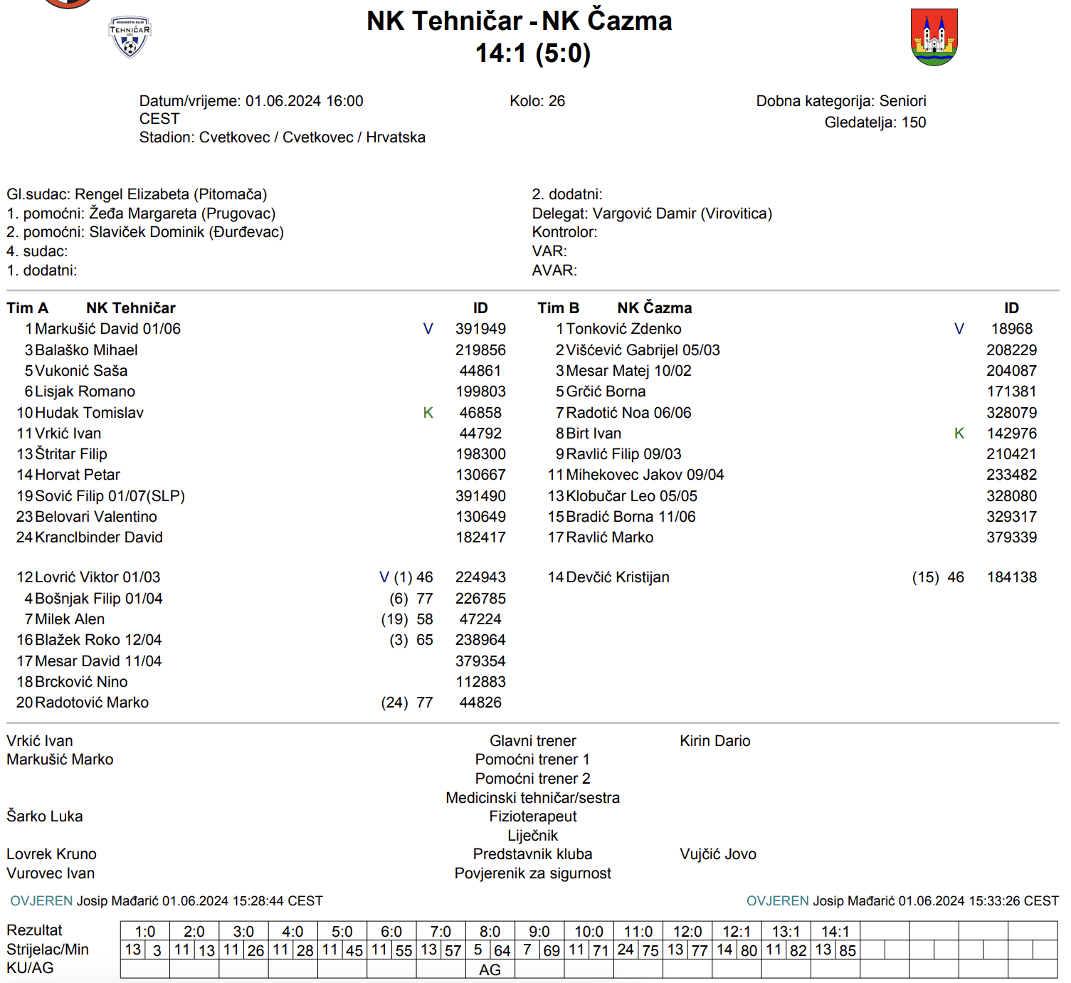 Jednosmjerna utakmica u kojoj je Tehničar postigao čak 14 pogodaka. Strijelci su bili Ivan Vrkić, koji je zabio 7 puta, prestigavši Filipa Kožuhara i postavši najbolji strijelac lige s 30 pogodaka. Filip Štritar zabio je 4 puta, Alen Milek i David Kranclbinder postigli su po jedan pogodak, dok je Borna Grčić postigao autogol. Počasni pogodak za Čazmu postigao je Kristijan Devčić. Tehničar je završio sezonu na prvom mjestu s 20 pobjeda, 3 neriješene utakmice i 3 poraza, postigavši 82 gola i primivši 25, te imaju najbolji napad i obranu lige. Čazma je završila posljednja s 8 bodova.