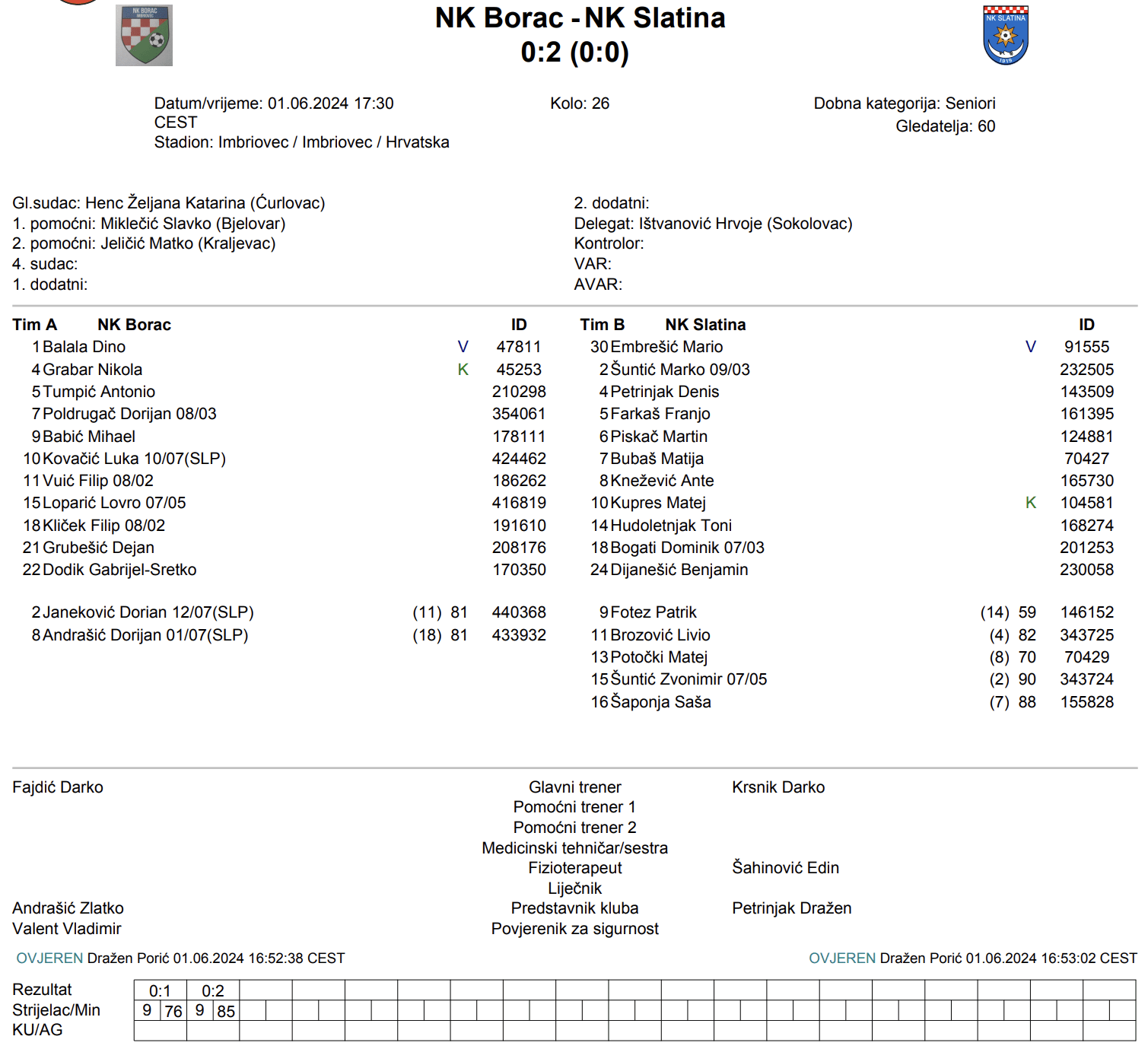Slatina je u Imbriovcu uzela 3 boda s 2 pogotka Patrika Foteza u 76. i 85. minuti. Borac je završio sezonu na 10. mjestu s 32 boda, dok je Slatina završila na 4. mjestu sa 46 bodova i izborila ulazak u viši rang.