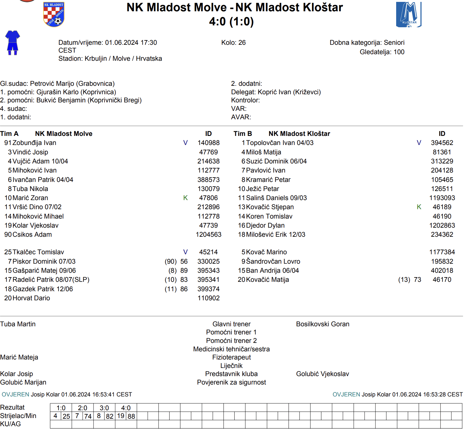 Zaslužena pobjeda danas. U prvom poluvremenu smo trebali imati riješenu utakmicu, ali smo vodili tek 1-0. Drugo poluvrijeme je bilo kao crna rupa tijekom 15 minuta, i imali smo dosta sreće što nas Kloštranska Mladost nije kaznila. Nakon nekoliko zamjena, tek smo stabilizirali igru i postigli drugi pogodak, zatvarajući utakmicu s dva pogotka. Čestitam Kloštranskoj Mladosti na fer igri i korektnom ponašanju. Ovo je bila izuzetno teška i turbulentna sezona za nas, gdje smo odigrali nekoliko dobrih utakmica, ali sportska sreća nije bila na našoj strani. Unatoč tome, smatram da smo po prikazanoj igri zaslužili dosta više bodova na svom kontu. Ostaje nam satisfakcija da smo pružili priliku nekolicini mlađih domaćih igrača, koji su zalog za budućnost. – istaknuo je trener Mladosti iz Molva, Martin Tuba.