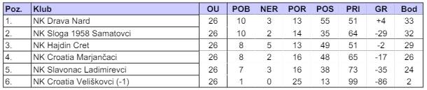 Efikasno je bilo i u Ligi za ostanak, u dvije utakmice postignuto je čak 13 golova. Bez borbe su do bodova došli nogometaši Sloge, dok je dvoboj Drave i Slavonca završen podjelom bodova uz po tri gola na svakoj strani, a s obzirom na prigode moglo ih je biti i više. Poveli su gosti golom Matea Janjića, poravnao je Zdenko Skelac i na odmor se otišlo u egalu. U nastavku odlično kreću gosti iz Ladimirevaca, još jednom Janjić pa nakon toga Damir Hemetak donose dva gola prednosti, no domaćin se ne predaje, Nikola Skelac je smanjio, a u 78. minuti Boris Ranogajec poravnao na konačnih 3:3. Pravu golijadu vidjeli su navijači Hajdina koji su do nogu potukli goste iz Marjančanaca. Već u prvoj minuti krenula je golijada, prvi od svoja tri gola zabio je Damir Lešković, do odmora je bilo 5:0, jednom su gosti sami pogodili svoju mrežu, a po jednom su zabijali Štefan Skelac i Karlo Vincek. U nastavku počasni gol za Croatiju postiže Dominik Dakić, dok je u završnici razigrani Lešković svojim trećim golom stavio točku na i.