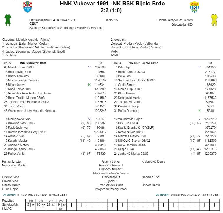 Već u petoj minuti Vukovar je nakon asistencije Marlona Roosa preko Zinedina Mustedanagića došao do prednost što nam je donijelo dosta živu, zanimljivu utakmicu. BSK nije imao što čekati, pa se gledao sasvim dobar nogomet, naravno, koliko je to teren u Borovu naselju dozvoljavao. Zelena podloga na stadionu Vukovara neusporedivo je bolja nego prije mjesec dana, no još uvijek to nije kako bi trebalo biti. U prvom dijelu BSK je imao jednu veliku priliku za poravnanje, u nastavku je Vukovar odlično krenuo, mogao je riješiti pitanje pobjednika u desetak minuta igre, no i njegovi su napadači bili neprecizni. Sve do 66. minute kada je Vukovar odradio sjajnu polukontru, na kraju je Zinedin sjajno poslužio Robina koji je obišao Đilasa i pogodio za 2:0. U 81. minuti BSK se vraća u igru, Josip Tomašević dočekao je jednu nešto lošiju reakciju Mandića koji je odbio jedan nezgodan pokušaj, pospremio je loptu u mrežu i donio nam uzbudljivu završnicu. Uspio je Vukovar primiriti BSK, bio je dojam da će privesti utakmicu kraju, no na samom isteku 90. minute Ivana Aleksića lopta pogađa u ruku u kaznenom prostoru, Ilan Pejić je dobio i iskoristio priliku s bijele točke te postavio konačnih 2:2. Ne kaže se bez vraga da je 2:0 najgori rezultat u nogometu. Iako bi malo tko odbio da ima taj rezultat deset minuta prije kraja. Vukovaru ovi izgubljeni bodovi ionako neće nedostajati za ništa, dok je BSK-u taj jedan bitan u borbi za ostanak, ovih 2:2 njihov su omiljeni proljetni rezultat, a ovo im je i deseti bod od 12 mogućih u posljednja četiri kola.
