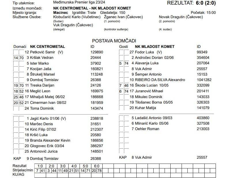 Sjajna utakmica Centrometala koji nastavlja svoj vrhunski niz neporaženosti. Na domaćem terenu sredili su jednu od lošijih ekipa lige i to sasvim zasluženo. Šest golova, šest različitih strijelaca donijelo je tri vrijedna boda. Redom su zabijali Jaša Kocijan (41′), Vedran Kršlak (44′), Darijan Treska (49′), Ivan Cimerman (51′), Filip Kirić (71′) i Erik Glogovec (78′).