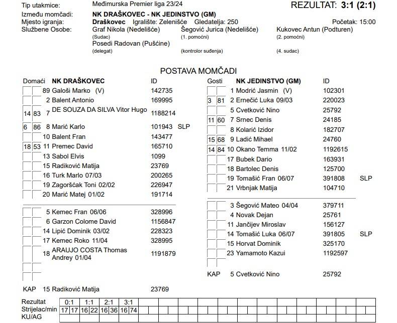 Prva pobjeda novog trenera Draškovca Davora Piškora na klupi nakon dva neriješena rezultata. Odličan je ovo vjetar u leđa pred dvoboj sljedećeg vikenda protiv Dinama iz Palovca. Dario Bubek zabio je za vodstvo Jedinstva u 17. minuti susreta. Nakon toga na scenu je stupio Mario Turk i riješio pitanje pobjednika. On je s tri pogotka (22′, 36′, 74′) zaključio susret i svojem klubu donio tri velika boda.