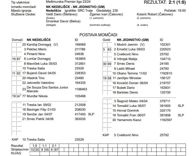 Nakon neočekivanog poraza od Draškovca u prošlom kolu, Nedelišće se vratilo pobjedama. Na domaćem terenu dočekali su Jedinstvo i dobro prikazanom igrom stigli do vrijedna tri boda. Poveli su domaćini preko Saše Treske, golom u 35. minuti susreta. Gosti se nisu predali te su bolje otvorili drugo poluvrijeme. Na 1:1 izjednačio je Mihael Ladić u 55. minuti susreta. Ipak, Nedelišće se nije dalo smesti te je 12 minuta kasnije zabilo za pobjedu. Zlata vrijedan gol dao je Domagoj Lončarić.