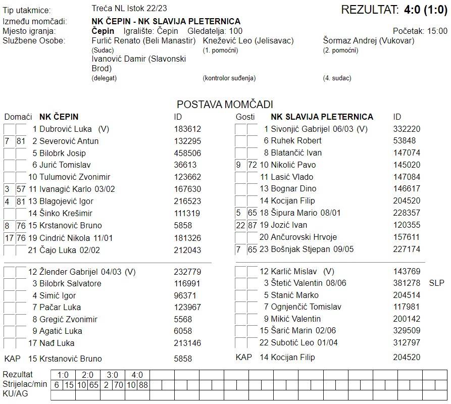Moćan start Čepina u drugi dio sezone, novi trener i nova momčad izgledali su odlično protiv Pleterničana koji su bili u igri sat vremena nakon čega su Zeleni odjurili do uvjerljive pobjede. Jedini strijelac u prvom dijelu bio je Tomislav Jurić, dok su u posljednjih 25 minuta pojedu Čepina uvjerljivom učinili Antun Severović te dvostruki strijelac i najbolji igrač utakmice Zvonimir Tulumović.