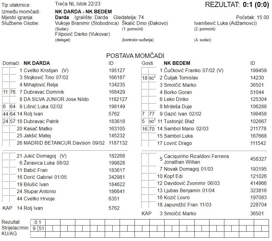 Fotokopija jeseni, u dvoboju Darde i Bedema minimalna pobjeda gosta. Sada je Bedem uzvratio Baranjcima za domaći poraz i u drugi dio sezone krenuo na pravi način! Jedan ali pobjede vrijedan pogodak djelo je Ivana Gazića u otvaranju drugog poluvremena. Domaćin je posljednjih 10ak minuta igrao brojčano inferioran nakon što je Relja Mihajlović zaradio isključenje zbog verbalnog delikta pa su gosti iz Ivankova mirno priveli utakmicu kraju.