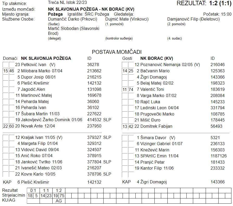 – Prvo čestitam dečkima na pristupu, prikazanoj igri i velikoj pobjedi. A kada nešto pripremate i onda to ekipa sprovede u djelo ne preostaje ništa drugo nego bit presretan. Odlično smo otvorili utakmicu s ranim pogotkom, odlično stajali na terenu svih 90 minuta, dobili nespretno gol za izjednačenje, imala je Slavonija još nekih poluprilika koje nije iskoristila ali ni mi nismo bili bezopasni po njihov gol. Pred kraj iskorištavamo jednu našu priliku i dolazimo do prednosti, a nakon toga toga imamo zicera kojeg na žalost nismo iskoristili kako bi mogli mirno privesti utakmicu kraju, ovako su domaći još pred kraj prijetili iz prekida ali bez opasno po naš gol. Odlično otvaranje polusezone i idemo dalje pripremati se za sljedeću utakmicu – izjavio je Saša Balatinac, trener Borca.