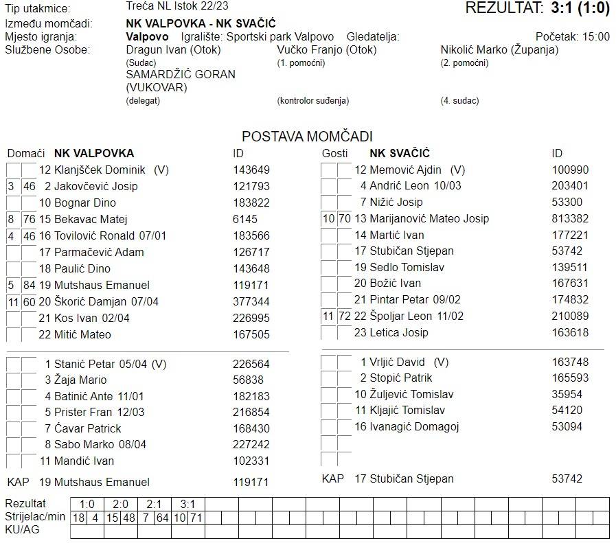 Svačić je u goste Valpovci stigao bez viroznog trenera Tadića, a vratio se u Stari Slatinik bez bodova. U oba međusobna susreta Zeleni su slavili i imaju odličan start i u drugu polusezonu. Povela je Valpovka golom Dine Paulića već u četvrtoj minuti, a niti otvaranje drugog poluvremena nije bilo puno sretnije za Svačić, sada su inkasirali gol u trećoj, a Valpovku je na 2:0 odveo njen prvi topnik Matej Bekavac. Svačić se uspio vratiti u igru nakon što je Josip Nižić poentirao u 64. minuti. Sedam minuta nakon toga domaćin je ponovno na +2, konačnih 3:1 postavio je Dino Bognar.