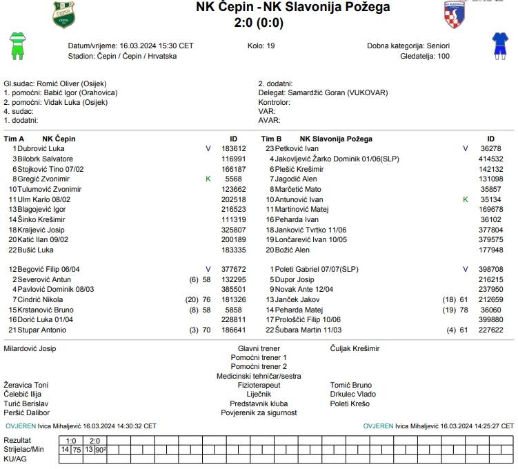 – Dobro smo ušli u utakmicu iako je Čepin imao inicijativu, imali su u tom periodu jednu odličnu priliku, nekakve opasne situacije ali smo se mi držali našeg plana i sve je išlo kako smo planirali. Nakon toga smo se dizali, imali smo svoje šanse i onda u toj 75. minuti primimo gol. Najprije je bio prekršaj na našem igraču, to je pušteno, nakon toga i mi pravimo prekršaj, a Šinko pogađa same rašlje, doslovno je pogodio mjesto gdje se spajaju greda i vratnica. Prije toga smo mi imali mrtvu šansu, Martinović je išao sam na golmana, da smo to zabili utakmica bi otišla u drugom smjeru. Nakon primljenog gola smo krenuli na sve ili ništa, zaigrali smo s četiri špice, pokušali sve ali nismo uspjeli, još je Čepin u zadnjoj minuti zabio i drugi gol. Ništa, čestitke Čepinu na zasluženoj pobjedi, odlična su ekipa, nimalo slučajno su tu gdje jesu. Moram i svojim dečkima čestitati, dali su sve od sebe, danas nije išlo, ali mi nastavljamo raditi i idemo od utakmice u utakmicu pokušavat ćemo biti sve bolji – rekao nam je trener Slavonije Krešo Poleti.