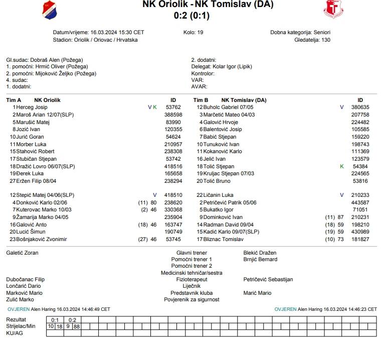 Tomislav je došao do novih bodova kojima ostaje u igri za naslov iako je zaostatak za Čepinom poprilično izražen, no ako nastave s pobjedama dočekat će Zelene na svom terenu u velikom derbiju i imati priliku zakomplicirati prvenstvo. U dosta izjednačenom prvom poluvremenu Andrijevčani su iskoristili za nijansu bolju prezentaciju i preko Ivana Tunukovića dolaze do prednosti koja je bila aktualna do same završnice. A onda je Bernardu Brnjiću dozlogrdilo živjeti u strahu od sve opasnijeg Oriolika, ubacio je u igru Ivana Dominkovića u 87, a ovaj je “isporučio” nakon samo 60ak sekundi za konačnih 0:2!