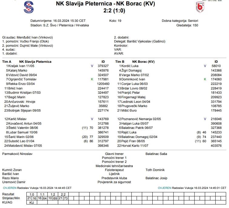 Još dva velika boda su iscurila iz Pleternice. Dolaskom Marka Žuljevića riješen je problem realizacije, no bodovni učinak je – loš. A počelo je dobro, kao i protiv Graničara, vodstvo je ponovno donio Marko Žuljević, ovaj put s bijele točke. Uspjeli su domaći odraditi utakmicu bez isključenja, išlo je sve po planu do 64. kada stiže crna rupa, najprije je Matej Fingernagl poravnao na 1:1, a onda samo pet minuta kasnije Borac ima prednost zahvaljujući Luki Rajiću. Četiri minute nakon toga, u 73. Marko Žuljević zabija i svoj drugi, ukupno treći gol u dva nastupa za Slaviju i postavlja konačnih 2:2.