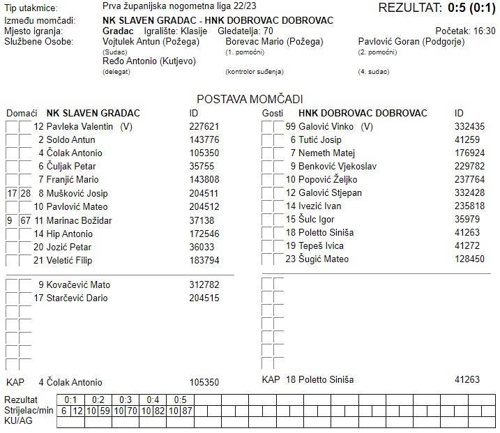 Težak poraz Slavena, drugi domaći u proljetnom dijelu sezone koji već sada potvrđuje da su Gračani osjetno slabiji u odnosu na jesenski dio. Brojni izostanci uslijed kojih je pored tri registrirana vratara na gol morao ozlijeđeni igrač, pa rana ozljeda ponajboljeg klupskog igrača Muškovića, pa crveni karton, sve se poklopilo u kratkom vremenu i gosti su to na krilima Željka Popovića kaznili i naplatili neke svoje probleme iz ranijih, pa i iz ove utakmice. Nažalost, priču sa zasluženog slavlja Dobrovca skreće generalni dojam je da je mladi sudac ove utakmice potpuno promašio zanimanje.