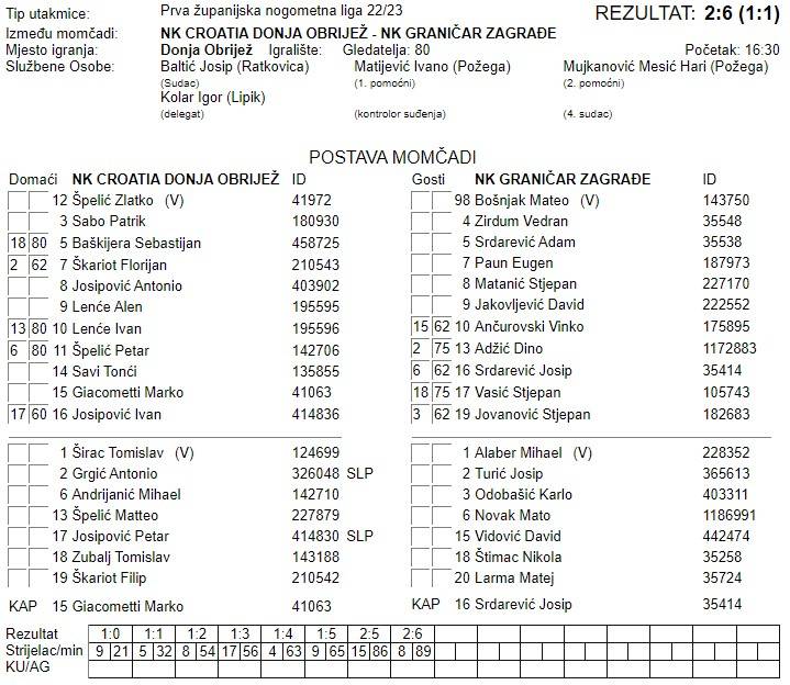 U Donjoj Obriježi pobjeda Graničara kojom je domaćin napravio još jedan veliki korak ka 2. ŽNL u sljedećoj sezoni. Povela je Croatia golom Alena Lenćea, a Graničar je do odmora uspio poravnati golom Adama Srdarevića. U nastavku rapsodija graničarske lokomotive, dva gola Stjepana Matanića, po jedan Stjepana Vasića, Vedrana Zirduma i Davida Jakovljevića, dok je poraz Croatije malo prihvatljivijim učinio njen najbolji igrač Marko Giacometti.