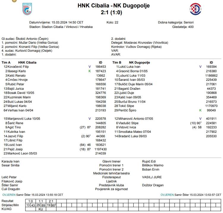 Utakmicom u Vinkovcima u kojoj je Cibalia ugostila Dugopolje otvoreno je 22. kolo Prve nogometne lige, posljednje u drugom krugu natjecanja. Puno problema s izostancima imao je gostujući trener koji je u zapisniku na klupi imao samo četiri igrača i pričuvnog vratara, tim je imperativ pobjede za Cibaliju bio još veći.