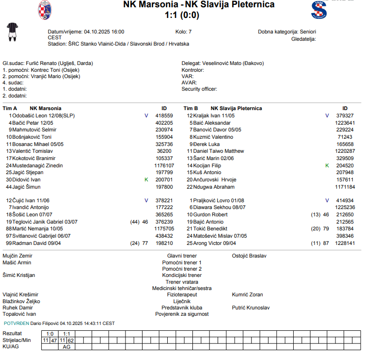 Jako dobra utakmica u Brodu, posebno kad u tu ocjenu ukalkuliramo važnost bodova za koje su se borili Marsonia i Slavija. Sjajan dekor, debelo preko 1000 gledatelja, raspjevana Legija, odličan travnjak i ekipe koje su izašle na teren nadigravati se a ne tući se kako to u derbijima često bude. Uvodnih 15-ak minuta Marsonia je dominirala, bila opasnija, no ne i konkretna pa je Kraljak ostao bez posla. Nakon toga slijedi 15ak minuta ravnopravne igre, a onda u 30. minuti i prva velika prilika gostiju koju je efektnom paradom u korner skrenuo Odobašić. Slijedilo je desetak minuta u kojima je Slavija bila bolja, sijevali su ubačaji sa svih strana, no ništa nije pronašlo Kuša ili nekoga od priključenih ofenzivaca. Za kraj prvog dijela velika prigoda za Marsoniju, no kod pokušaja Mustedanagića istaknuo se Kraljak pa se na odmor otišlo bez golova. Samo su oni nedostajali za ocjenu – odličan.