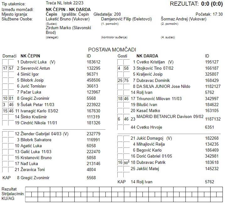 U večernjem terminu Čepin i Darda su odigrali bez golova ali i pokazali da i ako mreže miruju utakmica može biti zanimljiva i sadržajna. Tako su gledatelju u Čepinu vidjeli dosta prilika, posebice domaćina, vidjeli su zapucan kazneni udarac gostiju i čak tri crvena kartona. Izgleda kao “rat”, a nije bilo tako. U 35. minuti gosti ostaju s igračem manje nakon što je Ivan Bilušić zaradio drugi žuti karton zbog starta. U 44. minuti gosti iz Darde su zapucali kazneni udarac, a onda u posljednjih 10ak minuta imali i dva igrača manje nakon što je Ivan Rolj spriječio protivnika u izglednoj situaciji. Ni dva igrača viška nisu pomogla Čepinu da probije gostujući bedem, a onda u šestoj minuti Nikola Cindrić smanjuje brojčanu razliku pokupivši drugi žuti radi brutalnog prigovora riječima “jesi smiješan”! Kako bi onomad na Marakani rekli, pogibeljan, surov, bezobrazan, rječnik da ga ozljedi, najgori prigovor Kraj uljare godinama unazad!