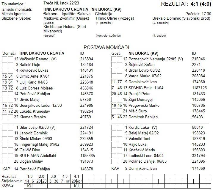 Velika pobjeda Đakova u borbi za ostanak! Od početka je domaća momčad krenula odlučno, motivirano i vrlo brzo je došla do prednosti, u šestoj minuti s bijele točke prednost Đakovu donio je kapetan Fabijan Petričević. Do odmora je Boškovićeva momčad praktično osigurala pobjedu, u 20. minuti strijelac je Krunoslav Luketić, deset minuta kasnije Duje Batinić, a u sudačkom dodatku prvog dijela na velikih 4:0 diže Karlo Ljulj. Od 51. minute gosti su nakon isključenja Lovre Brdara igrali i s igračem manje pa se dalo naslutiti da bi mogli doživjeti i pravi potop, no ipak su se konsolidirali, zatvorili prilaze svom golu i na kraju iz kaznenog udarca preko Danijela Polaneca uspjeli ublažiti poraz koji na kraju s obzirom na sve čak izgleda i pristojno.