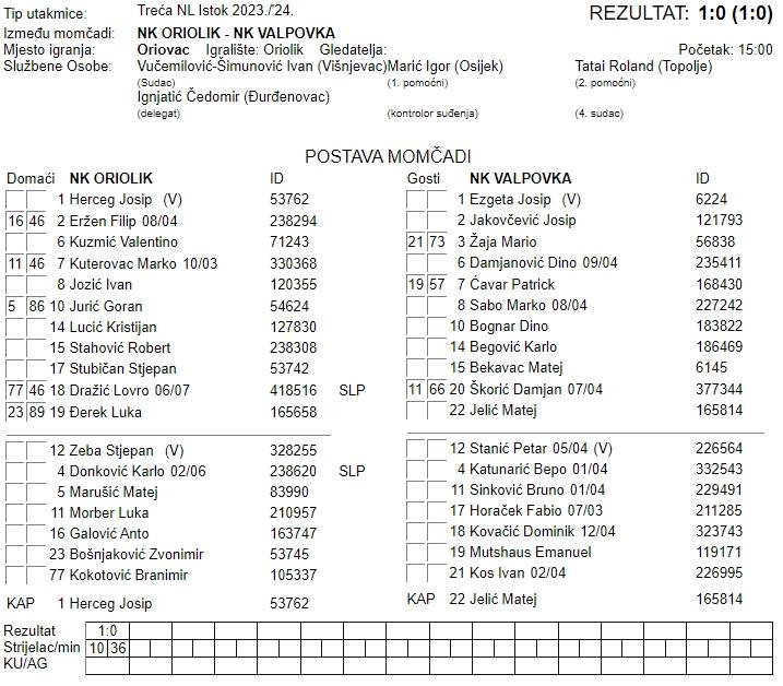 Nakon dva neuspjeha na domaćem terenu Oriolik se vratio pobjedama, minimalna rezultatski, ali maksimalno vrijedna pobjeda nad Valpovkom vraća boju u lica nogometašima i navijačima Oriolika. Najzaslužniji za pobjedu je Goran Jurić koji je jedini gol na utakmici postigao u 36. minuti, a gostima iz Valpova nije pomoglo niti više od pola sata s igračem više. Ono što si nikako nitko među crvenima nije želio, crveni karton koji ga izbacuje iz kombinacija za ogled s Dinamom, zaradio je Ivan Jozić zbog dva oštra starta. Kako bilo, Oriolik i Valpovka pred sobom imaju dosadnu sezonu, predaleko su od vrha, još dalje od dna.