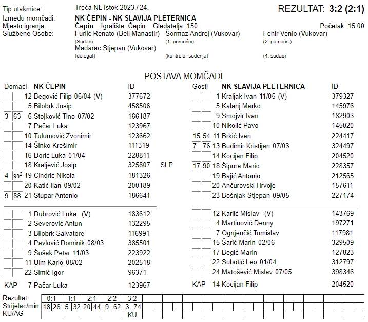 Sve samo ne lako Čepin je došao do svoje tek druge domaće pobjede ove sezone. Slavija je još jednom ostavila jako dobar, na momente i odličan dojam, no ostavila je i sve bodove u Čepinu. Sredinom prvog poluvremena Mario Šipura donio je prednost Slaviji, no kratko je trajala, šest minuta kasnije Josip Bilobrk poravnava, a na odmor Čepin odlazi s vodstvom koje mu je donio Ilan Katić u 44. minuti. Nisu se gosti iz Pleternice predali, dapače, odigrali su hrabro i došli do nagrade u 62. minuti kada na 2:2 poravnava Ivan Smojvir. U 74. minuti sudac Furlić pokazuje na kreč zbog povlačenja u gostujućem kaznenom prostoru, Salvatore Bilobrk preuzima odgovornost i pogađa za konačnih 3:2.