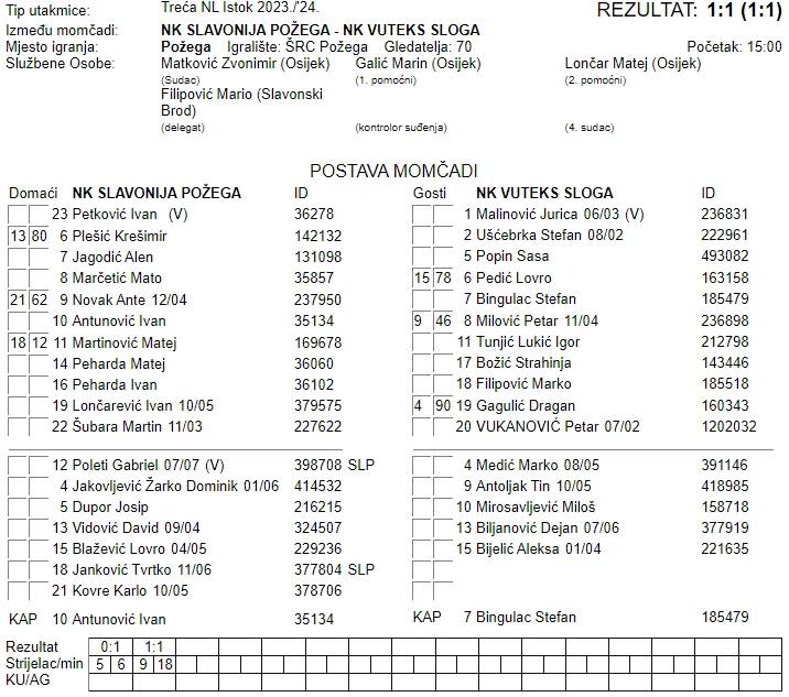 Stala je dobra serija Slavonije, nakon četiri pobjede očekivala se i peta na domaćem terenu, no Saša Popin i društvo iz Vukovara imali su drugačije planove. Odnijeli su Vuteksovci bodove iz Čepina, minute su ih dijelile od uspjeha i u Slatiniku, bila su to dobra upozorenja Poletijevoj momčadi, no nije vrijedilo. U samom otvaranju utakmice baš je iskusni Popin donio vodstvo Vuteksu već u šestoj minuti, bio je to nagovještaj problema za domaće koji se ipak vraćaju na vrijeme, u 18. minuti mladi Ante Novak zabija svoj drugi gol sezone i vraća stvari na početak. Imali su Požežani dovoljno vremena za potpuni preokret, ali nisu uspjeli pa vrijedan bod plovi na Dunav.