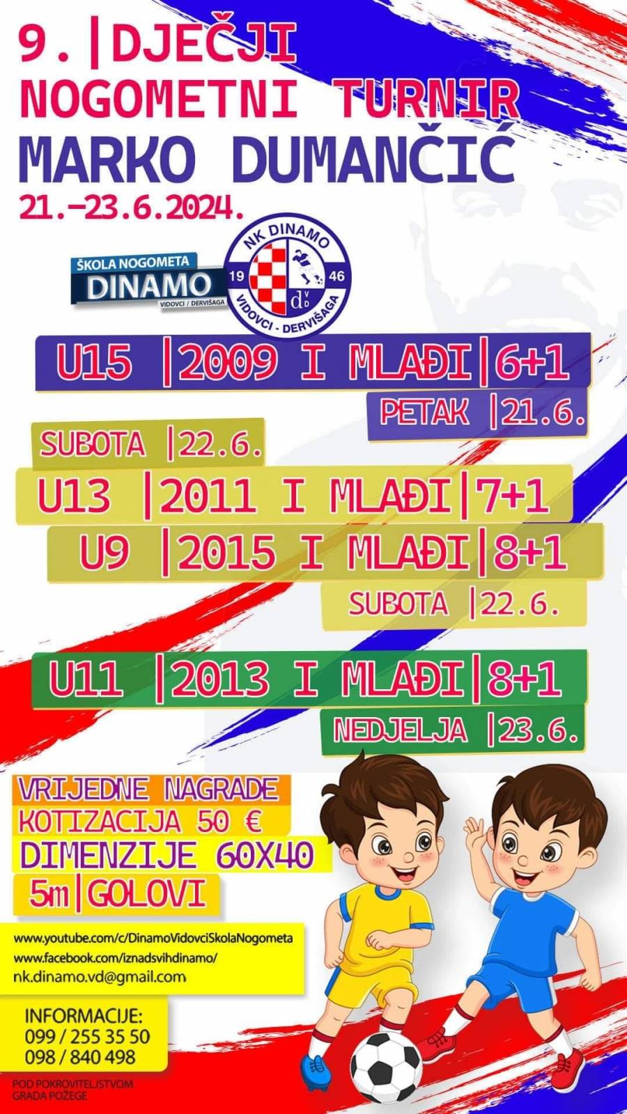 VIDOVCI – Od 21. do 23. lipnja 2024. u Vidovcima će se održati 9. Nogometni turnir mlađih kategorija u organizaciji Nogometnog kluba Dinamo Vidovci – Dervišaga. Odlukom uprave kluba od ove godine turnir nosi naziv po dugogodišnjem igraču, tajniku i članu uprave Marku Dumančiću koji nas je nažalost prerano napustio 06. 12. 2023. u 46. godini života.