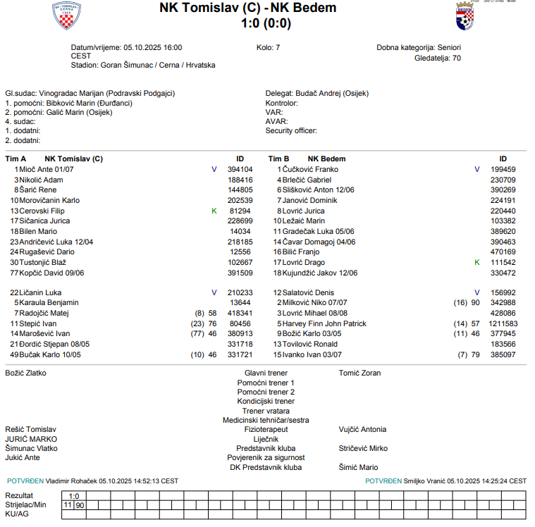 ‒ Rekao bih da je najrealniji ishod ove utakmice remi, no ne mogu reći da Cerna nije zasluženo pobijedila. Bili su bolji u polju, no što se šansi tiče bilo je potpuno izjednačeno, nešto prije njihovog gola mi smo imali zicer za pobjedu, nismo ga iskoristili… Nećemo bacati koplje u trnje, ima se puno igrati, naš najveći problem su ozljede, imamo ih stvarno dosta, a kako smo na knap s kvalitetom to nam je veliki hendikep jer nas je i na treninzima malo. Okrećemo se Čepinu, to nam je utakmica od iznimne važnosti, tu se moramo maksimalno spremiti i učiniti sve da osvojimo tri boda, siguran sam da bi ta jedna pobjeda bila veliki motiv za dalje da povežemo nekoliko dobrih rezultata i uhvatimo priključak ‒ mišljenje je Zorana Tomića, trenera Bedema.