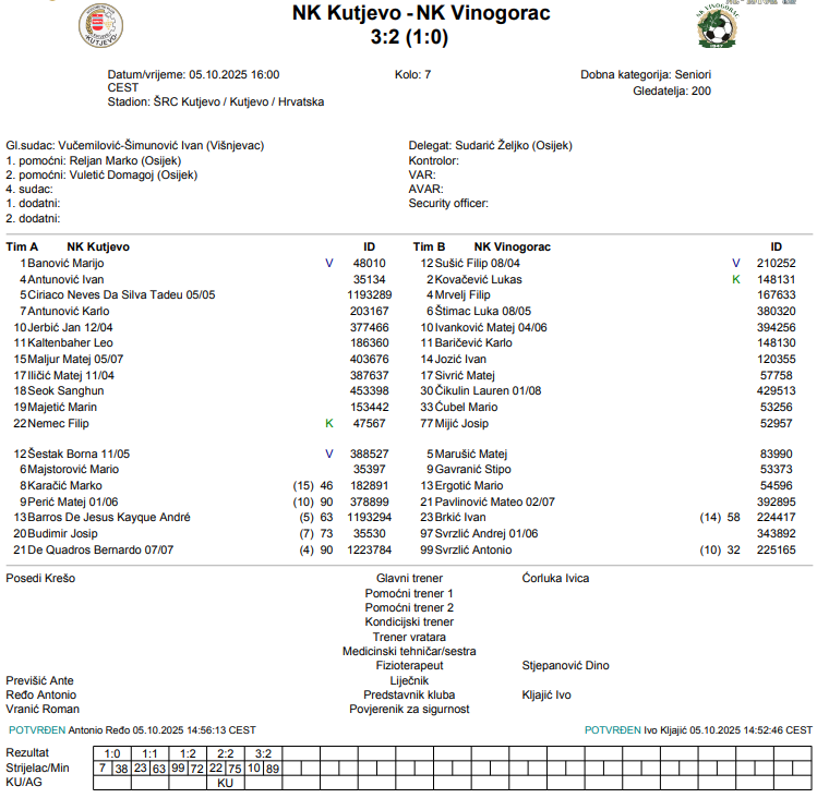 Fantastična nogometna predstava u Kutjevu i na kraju nakon serije preokreta pobjeda domaćina koja mu vraća mir nakon mini serije loših rezultata. U prvom dijelu jedini strijelac bio je Karlo Antunović koji je glavom poentirao u 38. minuti, a tih 1:0 je bio i rezultat na odmoru. U drugom dijelu mreže su mirovale sve do 68. minute kada kreće show. Ivan Brkić je u toj 68. pogodio za 1:1, a potpuni šok za domaće stiže četiri minute kasnije kada Antonio Svrzlić prekrasno pogađa za 1:2. Nisu se gostujući navijači do kraja izgrlili slaveći vodstvo, a već na drugoj strani kazneni udarac za Kutjevo, izborio ga je Jan Jerbić, a u poravnanje pretvorio kapetan Filip Nemec. Nakon malog zatišja, u 89. minuti novi gol, odlučujući, Sušić nije uspio ukrotiti udarac Josipa Budimira, na odbijenoj je najbrži Jan Jerbić i to je 3:2 za Kutjevo, a za Jana titula igrača utakmice. Treći je to uzastopni poraz Vinogorca u gostima, treći s golom minusa, dojam je dobar, ali od “blizu” se ne živi. Kutjevo se lansiralo u gornji dio ljestvice, nakon pobjede sve izgleda puno bolje!