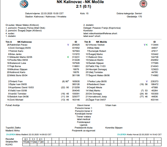 “Prvo poluvrijeme za zaborav, neke stvari smo dogovorili, ali jednostavno vremenski uvjeti (vjetar) i neke naše odluke bile su kontra svega toga, te je i sam rezultat opravdan. Gosti su zasluženo poveli! Na poluvremenu hladimo glave i stajemo na loptu, preuzimamo inicijativu te stvaramo šanse koje su i plod prvog gola! Nespretna situacija u 16 metara i penal za protivnika koji, na našu sreću, gosti ne koriste, ali utakmica nastavlja našom boljom igrom te zasluženo zabijamo za 2:1. Nakon toga nema predivne igre s obje strane, ali utakmica završava u našu korist! Čestitam svojim dečkima na prikazanom u drugom poluvremenu! Hvala našim navijačima koji nas vjerno prate i daju nam vjetar u leđa! Gostima hvala na fer i korektnoj igri, te puno sreće u nastavku prvenstva!” – komentirao je Zlatko Topolčić, trener Kalinovca