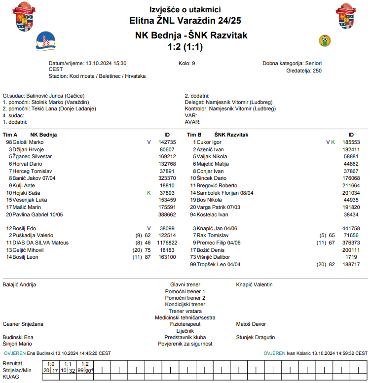 Prvo bih iskoristio priliku da čestitam ekipi Bednje na utakmici koja im slijedi s Rijekom i poželim sreću u istoj. Što se tiče naše utakmice, jako loš teren i čvrsta utakmica. Možda bi bilo najrealnije da je ostalo neriješeno, ali greška golmana nam je otvorila priliku za drugi gol i pobjedu što smo objeručke prihvatili. Nemam puno što dodati, radujem se pobjedi! Bednja je najbolji protivnik s kojim smo igrali, malo više smo imali sreće i to je to. Raste nam samopouzdanje i borit ćemo se sigurno do kraja jer smo kvalitetna momčad. Nije ništa slučajno, moji igrači rade odlično i vrlo su karakterni pa sve to dolazi do izražaja. – sretan je nakon velike pobjede svoje momčadi Valentin Knapić, trener Razvitka.