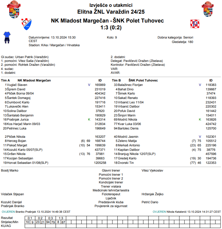 Spletom okolnosti tijekom tjedna napustio nas je dosadašnji igrač koji je ujedno i bio trener, pa sam konce morao preuzeti u svoje ruke. Što se utakmice u Margečanu tiče, to je uvijek za nas bio svojevrstan derbi, a u derbiju uvijek težiš pobjedi. Bili smo bolji tijekom cijele utakmice i to smo dokazali na terenu. Rano smo poveli i kontrolirali igru. Domaći su također imali svoje šanse koje nisu iskoristili. Nakon trećeg gola smo se opustili, ali smo utakmicu uspjeli privesti kraju i pobijediti. Imamo još pet kola do kraja jesenskog dijela i priliku da budemo što bliži vrhu. Čestitam ekipi i nadam se nastavku dobrih rezultata i dalje! – izjavio je Vjekoslav Vitez nakon pobjede Poleta.
