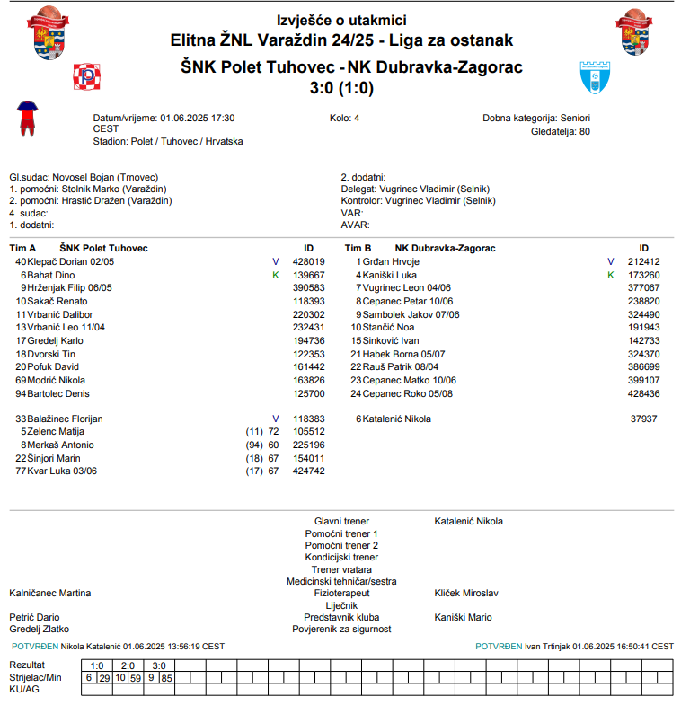 Relativno lagan zadatak bio je pred momčadi Poleta koja je ugostila Dubravku-Zagorac. Na predah se otišlo pri rezultatu 1:0, strijelac jedinog pogotka za domaće bio Bahat u 29. minuti. Po nastavku susreta domaći zabijaju još dva pogotka kako bi osigurali pobjedu i nova tri boda. Strijelci su bili Sakač u 59. i Hrženjak u 85. minuti.