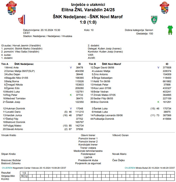 Nedeljanec je minimalnom pobjedom bio bolji od Novog Marofa i tako prekinuo niz od četiri utakmice bez pobjede. Tomislav Medved bio je heroj domaćina jer je jedini on zatresao mrežu na ovoj utakmici. Novi Marof je nakon ove utakmice došao do šest poraza, a toliko su prethodne sezone imali u 25 utakmica.