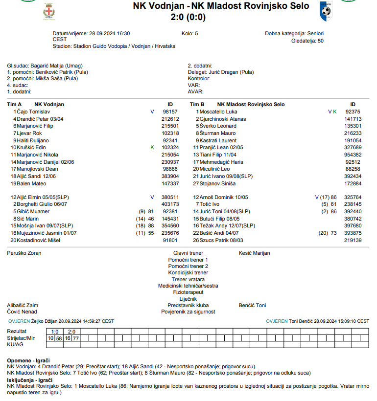Vodnjan je na domaćem terenu došao do važnih bodova pobjedom nad NK Mladost Rovinjsko Selo rezultatom 2:0. Prvi pogodak za domaćine postigao je Edin Kruškić u 58. minuti, dok je Jasmin Mujezinović osigurao pobjedu drugim golom u 77. minuti.