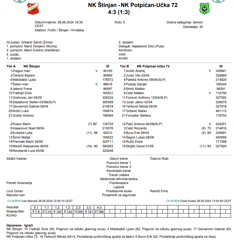 U jednoj od najuzbudljivijih utakmica kola, NK Štinjan je nakon preokreta uspio slaviti protiv NK Potpićan-Učke 72 rezultatom 4:3. Gosti su poveli već u 8. minuti preko Mattea Celića, a samo nekoliko minuta kasnije, u 40. i 42. minuti, povećali su prednost na 3:1 golovima Slađana Simića i ponovo Celića.