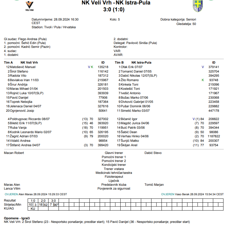 NK Veli Vrh odigrao je uvjerljivu utakmicu pred domaćim navijačima, svladavši NK Istru-Pulu s 3:0. Mihael Maras postigao je brzi pogodak već u 3. minuti, a Daniel Jelenaca povećao je prednost u 62. minuti. U završnici utakmice, Vanja Ruba je potvrdio pobjedu Velog Vrha pogotkom u 90+3. minuti.