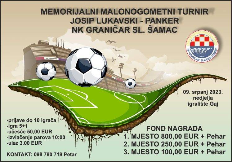 Nogometni klub Graničar iz Slavonskog Šamca se također memorijalnim malonogometnim turnirom prisjeća svoga neprežaljenog igrača Josipa Lukavskog Pankera. Turnir će se održati 9.srpnja na igralištu Gaj, toga dana će u prijepodnevnim satima biti izvlačenje parova koji će krenuti u bitku za primamljive nagrade. Detaljnije pročitajte na plakatu gdje možete pronaći i kontakt za prijave pa ne propustite prigodu dobro se zabaviti, naigrati nogometa i pri tome i zaraditi pokoji euro.