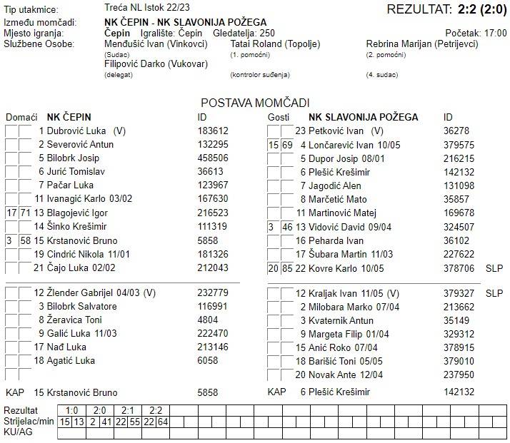 – Prije svega čestitke mojim igračima što su skupili snage dići se u drugom poluvremenu nakon što je Čepin bio puno bolji u prvih 45 minuta i zasluženo je vodio 2:0. Oni su nam prepustili loptu nakon prvog gola, no nismo bili konkretni. U nastavku smo bili pravi, uspjeli izjednačiti i nakon toga smo tražili potpuni preokret ali nismo uspjeli. Nakon 2:0 svakako moramo biti zadovoljni bodom s ovako teškog gostovanja. Uzavrela je atmosfera u Čepinu, čestitke Siouxima na 29. rođendanu koju su lijepo proslavili – komentar je Kreše Poletija, trenera Slavonije.