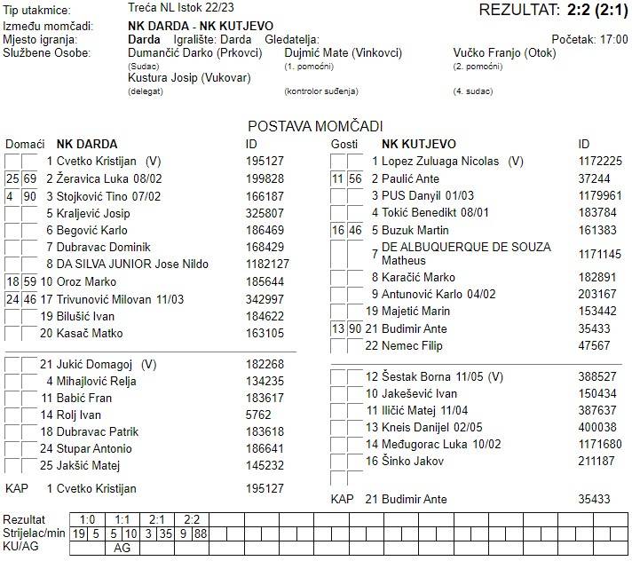 Vatreni početak i uzbudljivi završetak dvoboja u Dardi. Krenulo je odlično po domaće, u petoj minuti kutjevačku obranu na kapitulaciju je natjerao Ivan Bilušić, no prednost nije bila duga vijeka, suigrač mu Josip Kraljević je u desetoj minuti pogodio vlastitu mrežu i donio gostima egal. Tino Stojković u 35. minuti vraća Dardu na put pobjede, stigli su joj “na milimetar”, došli su u samu završnicu s golom viška, no onda se još jednom Karlo Antunović pretvara u junaka Zelenih i na asistenciju mladog Mateja Iličića zabija za konačnih 2:2.