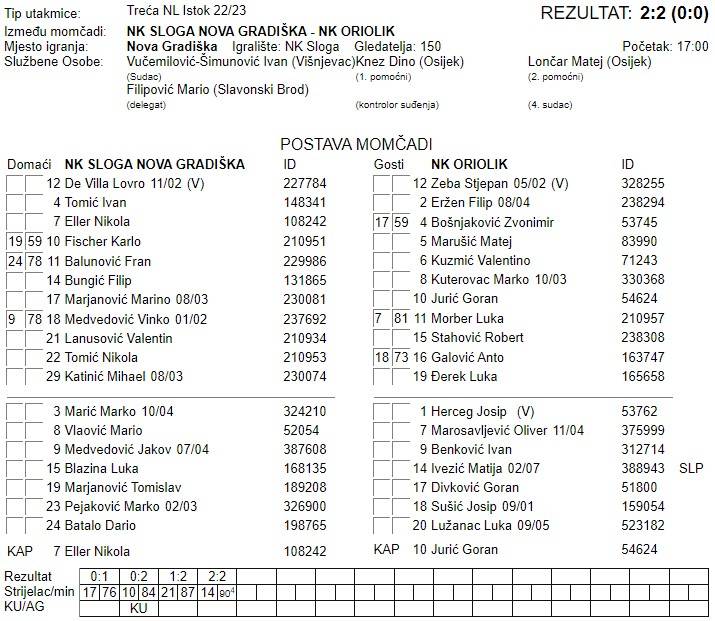 Uzbudljivu utakmicu odigrali su Sloga i Oriolik, ostaje dakle otvoreno pitanje tko je najbolji klub županije u ovom natjecanju, Oriolik je trenutno bod u prednosti u odnosu na Slogu, dok je Svačić pobjedom u Pleternici za bod bolji od Oriolika, do kraja će biti zanimljivo vidjeti tko će biti najuspješniji. Nije isključeno da je netko od gledatelja i otišao sa stadiona u Gradišci i nije vidio niti jedan od četiri pogotka jer ništa nije dalo naslutiti da će se sve odigrati kako se odigralo. Poluvrijeme bez golova, pa se ponadaš razigrat će se u nastavku, no ništa, sat vremena prolazi – ništa, ulazi se u posljednjih 15 minuta – ništa. A onda spektakl! Goran Divković u 76. donosi prednost Orioliku, u 84. Goran Jurić zabija i za 0:2, gostujući navijači lagano nazdravljaju novim bodovima, no nije kraj dok nije kraj. U 87. minuti Valentin Lanusović smanjuje zaostatak, a pravu erupciju oduševljenja domaćinu donosi Filip Bungić koji golom u četvrtoj minuti dodatka u Gradišci ostavlja jedan bod!