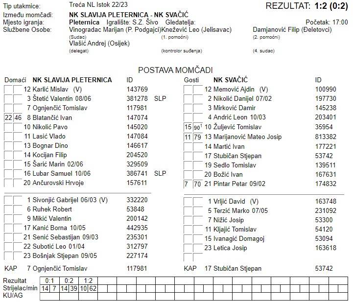 Svačić je otklonio sve dileme oko ostanka, i oni najoprezniji u Slatiniku večeras će nazdraviti uspješnoj sezoni! Sjajno otvaranje za Tadićevu momčad, već u sedmoj minuti Ivan Martić pogodio je za vodstvo gostiju, a kada je isti igrač pred odmor još jednom zatresao domaću mrežu već je bilo jasno da bi gosti trebali kući jako zadovoljni. Još malo vode na gostujući mlin i na početku drugog poluvremena. Praktično čitavo drugo poluvrijeme Slavija je igrala s igračem manje nakon što je Hrvoje Ančurovski skupio dva žuta kartona, time je sustizanje zaostatka značajno otežano, uspjeli su domaći fantastičnim golom Pave Nikolića smanjiti, no više od toga nije išlo pa Svačić još jednom iz Pleternice odlazi jako zadovoljan, na Šivi su jesenas otkinuli bodove i Slavoniji, zanimljivo, tada je Slavoniji presudio njen bivši igrač Tomislav Žuljević, sada Slaviji njen bivši prvotimac Ivan Martić.