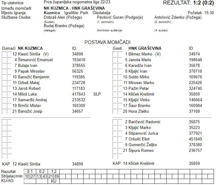 Prvi prvenstveni dvoboj u 2023. godini u Požeško slavonskoj 1. ŽNL završen je pobjedom gostujuće Graševine. Prvi pogodak u novoj godini djelo je Mirka Solde koji je Graševini donio prednost u 27. minuti, a da bi gosti otišli na odmor s dva gola viška pobrinuo se Petar Pažin koji je pogodio Klasićevu mrežu u 43. U samoj završnici domaći preko Josipa Banožića s bijele točke smanjuju zaostatak, no više od toga nisu mogli.