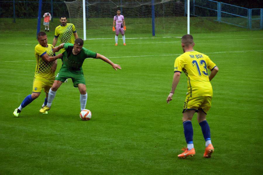 Na terenu oprezan ulazak i jednih i drugih, očekivano je lopta nešto više bila u nogama Zelenih, no bez ikakvih značajnijih opasnosti po gol branitelja naslova. Prva prava prilika je ona BSK-a iz šeste minute kada je Marko Aračić sjajno ubacio i na petercu pronašao Josipa Jakovljevića koji glavom tuče dobro u donji lijevi Zuluagin kut, no Kolumbijac sjajno reagira i brani svoju mrežu. Zatišje je trajalo sve do posljednjih 10ak minuta kada Kutjevo pojačava pritisak, redali su se ubačaji sa strane i iz kuta, udarci koji su završavali u bloku ili van okvira gola, no puta do Bučke mreže nisu pronašli. A onda 45. minuta i potez zbog kojeg je vrijedilo platiti ulaz, skrivati se od kiše ili kisnuti. Josip Jakovljević je zabio jedan od najljepših golova u karijeri, a znamo dobro da ih se i te kako nazabijao! Nakon jedne gužve lopta je došla do Jakovljevića na 7-8 metara, Zuluaga mu je istrčao u blok pa se Jakovljević povukao u stranu, bio je udaljen možda 2-3 metra od golaut linije i desetak metara od bliže mu vratnice, Zuluaga je ostao “na pola”, u sredini je jedan njegov suigrač bio među trojicom zelenih pa se majstor odlučio na udarac, modrićevski, vanjskom je naciljao i sjajno pogodio suprotne “rašlje”! Velemajstorski! Bila je to posljednja minuta prvog dijela, Žuti su još malo slavili a Zeleni – izjednačili! Najveći dio posla odradio je Brazilac Matheus koji je kombinirao na desnoj strani sa kapetanom Budimirom, pa ubacio oštru loptu koja je po petercu BSK-a došla do zaboravljenog Mateja Ilinčića koji je posprema u mrežu za egal na poluvremenu.