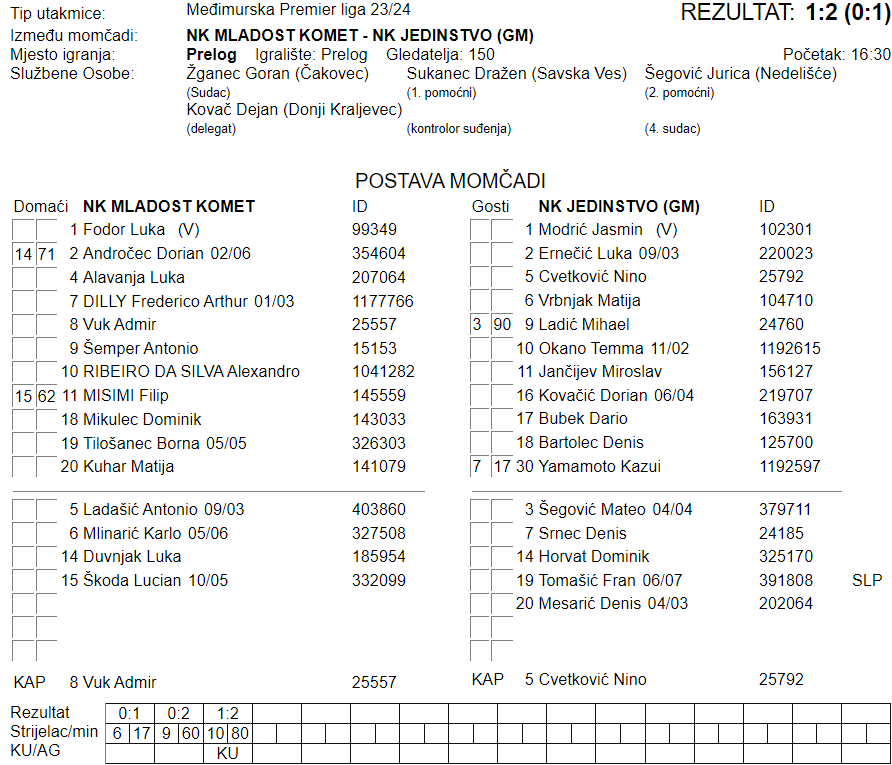 Važna pobjeda Jedinstva na gostovanju u Prelogu. Matija Vrnjak zabio je za vodstvo gosta u 17. minuti susreta. Mihael Ladić u nastavku je u 60. povisio na 0:2. Jedini gol domaćina dao je Alexandro u 80., preciznim udarcem s bijele točke.