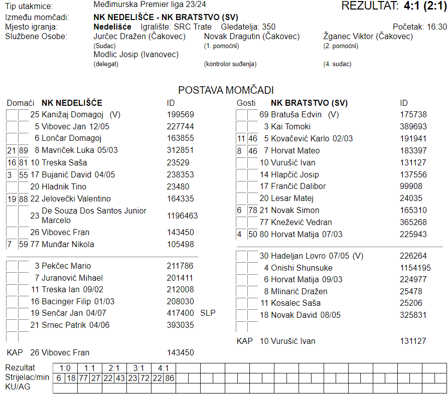 Rutinska pobjeda Nedelišća na domaćem terenu i dodatni udarac Bratstvu iz Savske Vesi koje se muči s formom. Domagoj Lončar zabio je za vodstvo domaćina u 18. minuti susreta. Izjednačio je Vedran Knežević u 27., Nedelišćani ipak odlaze s prednošću na odmor. Zasluge idu Valentinu Jelovečkom, koji je zabio gol u 43. minuti. U nastavku nova dva pogotka domaćeg sastava osigurala su im tri vrijedna boda. Prvo je Marcelo u 72. zabio za 3:1, da bi u 86. Jelovečki ponovno bio strijelac.