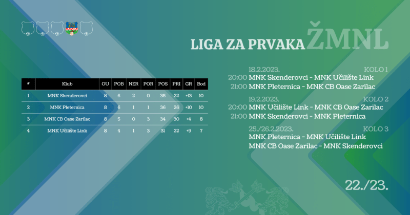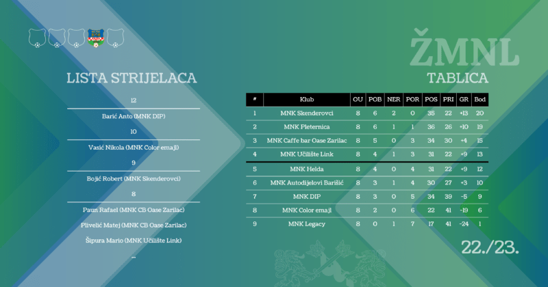 ekipa MNK CB Oase Zarilac, a četvrti sudionik doigravanja je MNK Učilište Link. S obzirom na to da će se bodovi prepoloviti u doigravanju, sve četiri ekipe imaju šansu osvojiti prvenstvo, a prednost imaju igrači MNK Skenderovci i MNK Pleternica. Vodeći strijelac lige trenutno je igrač MNK DIP Anto Barić koji je postigao 12 pogodaka.