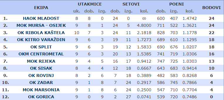 Dosad neporaženi odbojkaši Murse jučer su igrali derbi ovog kola protiv prošlogodišnjih prvaka Mladosti te su nakon 87 minute dobre odbojke morali potpisati prvu kapitulaciju ove sezone. Rezultat je na kraju bio 3:0 (25:21, 25:23, 25:22), a to nam dovoljno govori kojim tokom je išla utakmica. Mursaši su u prvom i drugom setu imali lijepo vodstvo, no u završnicama setova bolje su se snašli odbojkaši iz metropole te su nastavili s pobjedama ove sezone, a Mursa je ovim porazom prepustila prvo mjesto tablice upravo Mladosti, s tim da Mladost mora odigrati i utakmicu zaostatka protiv Rovinja što će odigrati za 10-ak dana. Sljedeći tjedan će biti paklen za Mursu jer prvo dočekuju grčki PAOK na domaćem terenu u drugoj utakmici šesnaestine finala CEV Challenge Cupa, a sljedeći vikend u Osijek dolazi uvijek neugodni Centrometal koji će htjeti uzeti bod(ove) Mursi nakon pobjede u Kaštelima.