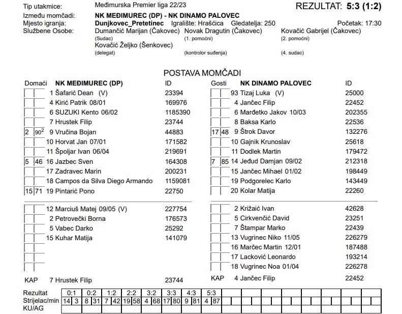 Luda utakmica u Dunjkovcu! Čak osam golova je palo i to nakon što su gosti vrlo rano vodili 0:2. Domaćin se uspio pribrati, preokrenuti i zasluženo slaviti na kraju susreta. Za Međimurec su golove dali Patrik Kirić (68′, 87′) dvaput te po jednom Filip Hrustek (42′), Pono Pintarić (58′) i Bojan Vručina (81′). Dinamovi strijelci bili su Damjan Jeđud (3′), Karlo Baksa (31′) i Leonardo Lacković (80′).