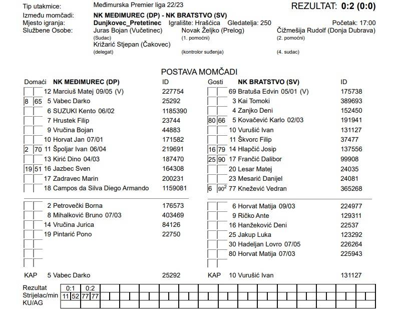 Još jedan derbi kola pripao je Bratstvu. Međimurec je ovim porazom vezao dvije utakmice u nizu bez pobjede, sveukupno tri kad se uračuna i Kup. Bratstvo je očito u drugom poluvremenu ubacilo u veću brzinu i iskoristilo svoje šanse. Prvo je zabio Filip Škvorc u 52. minuti susreta i zatim Vedran Knežević u 77. minuti.